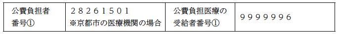 1.公費負担者番号(8桁):医療機関の所在地に応じて,京都府(京都市を除く)「28260503」,京都市「28261501」を記載