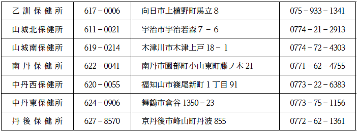 ★京都市以外の医療機関:京都府各保健所(http://www.pref.kyoto.jp/sanpai/mani.html)