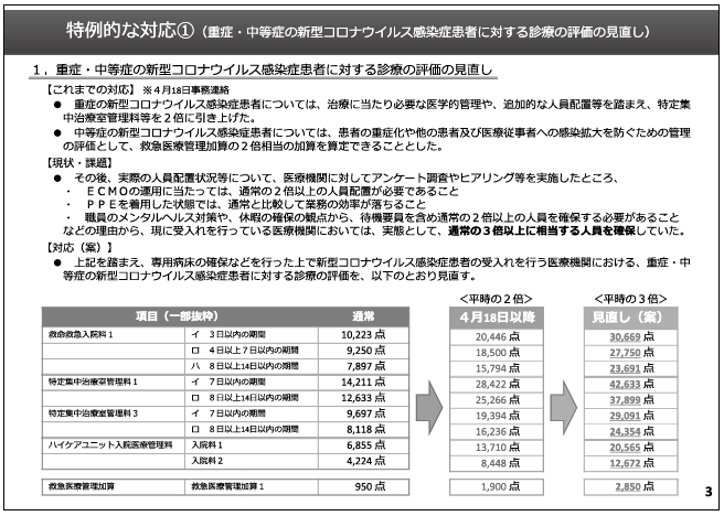 (1)専用病床の確保などを行った上で新型コロナウイルス感染症患者の受入れを行う医療機関において,当該専用病床に入院する重症の新型コロナウイルス感染症患者について,救命救急入院料,特定集中治療室管理料,ハイケアユニット入院医療管理料,脳卒中ケアユニット入院医療管理料,小児特定集中治療室管理料,新生児特定集中治療室管理料,総合周産期特定集中治療室管理料又は新生児治療回復室入院医療管理料(以下「特定集中治療室管理料等」という)を算定する場合には,別表に示す点数を算定できることとすること。