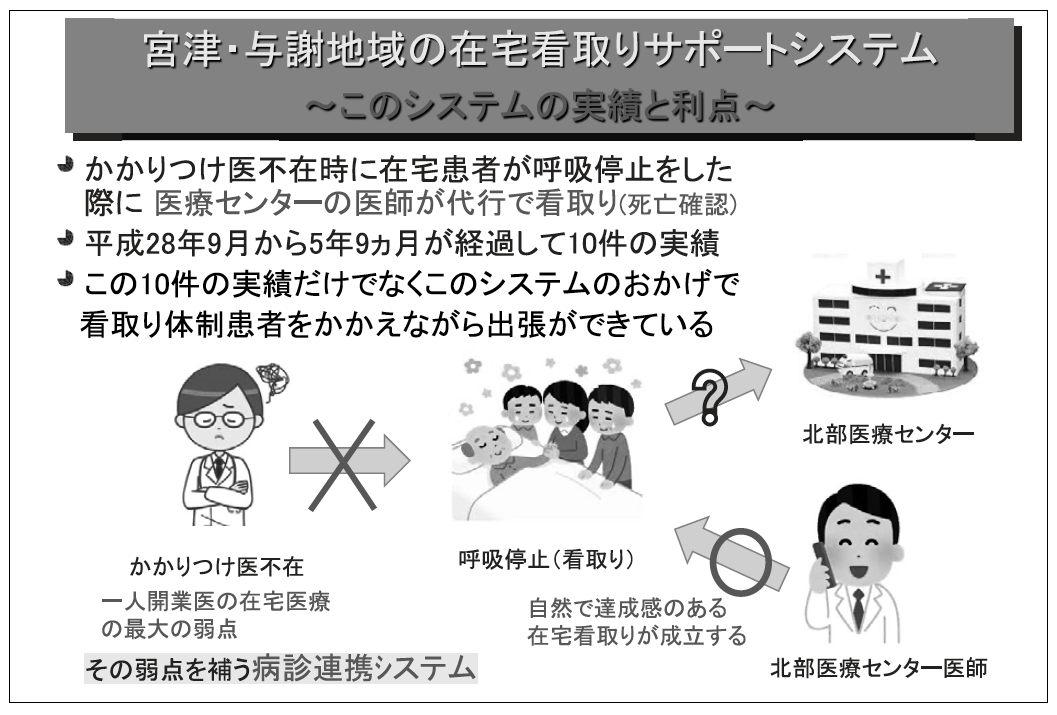 診療所17名、宮津武田病院1名、北部医療センター35名、丹後保健所と北丹医師会各1名、事務局2名の計57名の参加でした。山根与謝医師会長の開会の挨拶の後、来賓の重見丹後保健所長と齊藤北丹医師会長の挨拶をいただき、北部医療センター落合院長から「病院の現状と課題」についてプレゼンをしていただきました。与謝医師会からは平成28年9月から運用している「宮津・与謝地域の在宅看取りサポートシステム」(かかりつけ医が不在時に在宅患者が呼吸停止をした際に、死亡診断のために患者を北部医療センターに搬送するのではなく、北部医療センターの先生に代行で自宅まで往診していただき死亡確認をしていただくシステムで現在10例の実績)の内容と実績を報告し、北部医療センターの新任先生方に協力の継続をお願いしました。その後北部医療センターの先生方全員と与謝医師会会員全員の自己紹介をしていただき、最後に余興として北部医療センター黒星副院長(芸名:渚屋蘭学)に落語を披露していただきました。