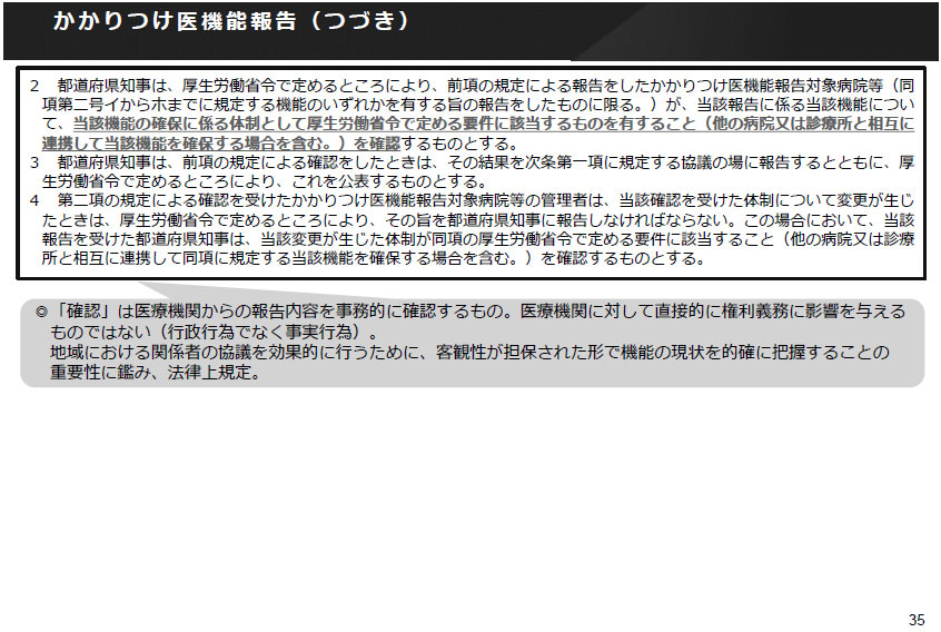 かかりつけ医機能が発揮される制度整備は,国民・患者が,そのニーズに応じてかかりつけ医機能を有する医療機関を適切に選択できるための情報提供を強化し,地域の実情に応じて,各医療機関が機能や専門性に応じて連携しつつ,自らが担うかかりつけ医機能の内容を強化することで,地域において必要なかかりつけ医機能を確保するための制度整備を行うこととされている。 そのために(1)医療機能情報提供制度の刷新(令和6年4月施行),(2)かかりつけ医機能報告の創設(令和7年4月施行),(3)患者に対する説明(令和7年4月施行)が計画されている。 医療情報機能提供制度の刷新は,国民・患者へのわかりやすい情報提供を実現するために項目が見直される予定で,今後有識者会議で検討される。 かかりつけ医機能報告は,医療機関が都道府県知事に慢性疾患を有する高齢者その他の継続的に医療を必要とする者を地域で支えるために必要なかかりつけ医機能を報告するものである。都道府県知事は,報告した医療機関が,かかりつけ医機能の確保に係る体制を有することを確認し,外来医療に関する地域の関係者との協議の場に報告するとともに,公表することとなる。 なお,報告はあくまで地域における現状の把握を目的とするものであり,都道府県知事がかかりつけ医を認定するものではない。また,多様なかかりつけ医機能を一つの医療機関がすべて一律に担うことを求めるものでもない。 本内容は,日医が昨年提言していた内容に沿うものであり,財務省が主張していた①法制上の明確化,②認定制,③事前登録・医療情報登録とはなっていない。 府医では,かかりつけ医は「制度化」するのではなく,その機能をより強化することこそが国民の信頼に応えることであり,それは診療科や開業,勤務医の別にかかわらず,個々の医療機関がそれぞれの機能に応じた役割を果たし,医療機関同士の連携によって,地域医療を面で支えることが重要と考えている。引続き国民皆保険制度の根幹をなすフリーアクセスの堅持を主張していく。