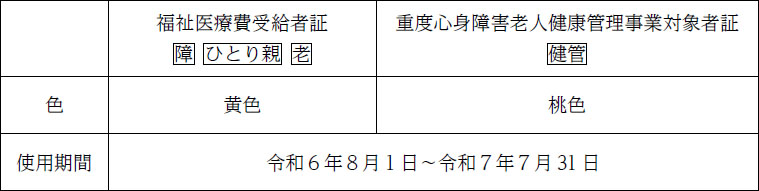 8月1日以降に交付される福祉医療費(障法別番号㊸・ひとり親法別番号㊹・老法別番号㊶)受給者証および重度心身障害老人健康管理事業(健管)対象者証の様式が下記のとおり更新されますのでお知らせします。