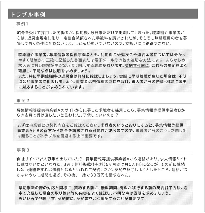 厚労省では,昨今,利用料金・違約金等の支払いを巡るトラブルが発生していることから,雇用仲介事業の利用にあたっての注意喚起のリーフレットを作成している。特に,令和7年4月より,雇用仲介事業者は,求人者に対し利用料金・違約金等について明示することが義務づけられており,求人側も,契約締結前に,明示された契約内容を十分に確認・検討していただく必要がある。義務を守っていない事業者との契約は,トラブルにつながる可能性があるため,契約締結前に,明示された契約内容を十分に確認・検討いただきたい。また,契約内容に合意できない場合はそのサービスの利用はせず,他の有料職業紹介事業者やハローワーク等を活用してほしい。
