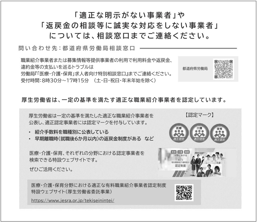 なお,職業紹介事業者や募集情報等提供事業者の利用で利用料金や違約金等の支払いを巡るトラブルが発生した場合は,最寄りの都道府県労働局『「医療・介護・保育」求人者向け特別相談窓口』で相談を受け付けているので利用いただきたい。