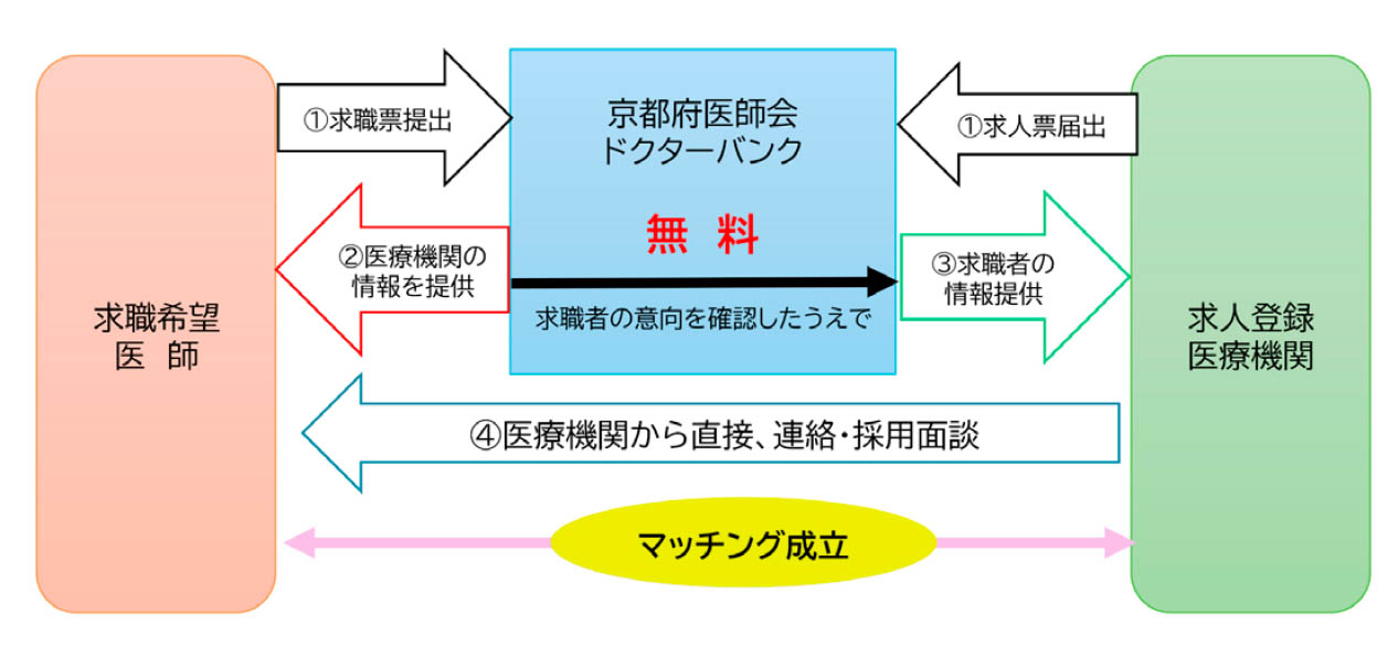 京都府医師会では,厚生労働省の認可を受け,2008 年4月から「京都府医師会医師無料職業紹介所」を稼動させました。京都府医師会ドクターバンクは,一般社団法人京都府医師会が独自に行う事業で,営利を目的とせず,適切な医療供給体制を担うための「医師無料職業紹介事業」です。