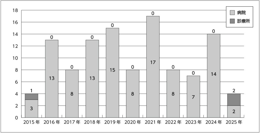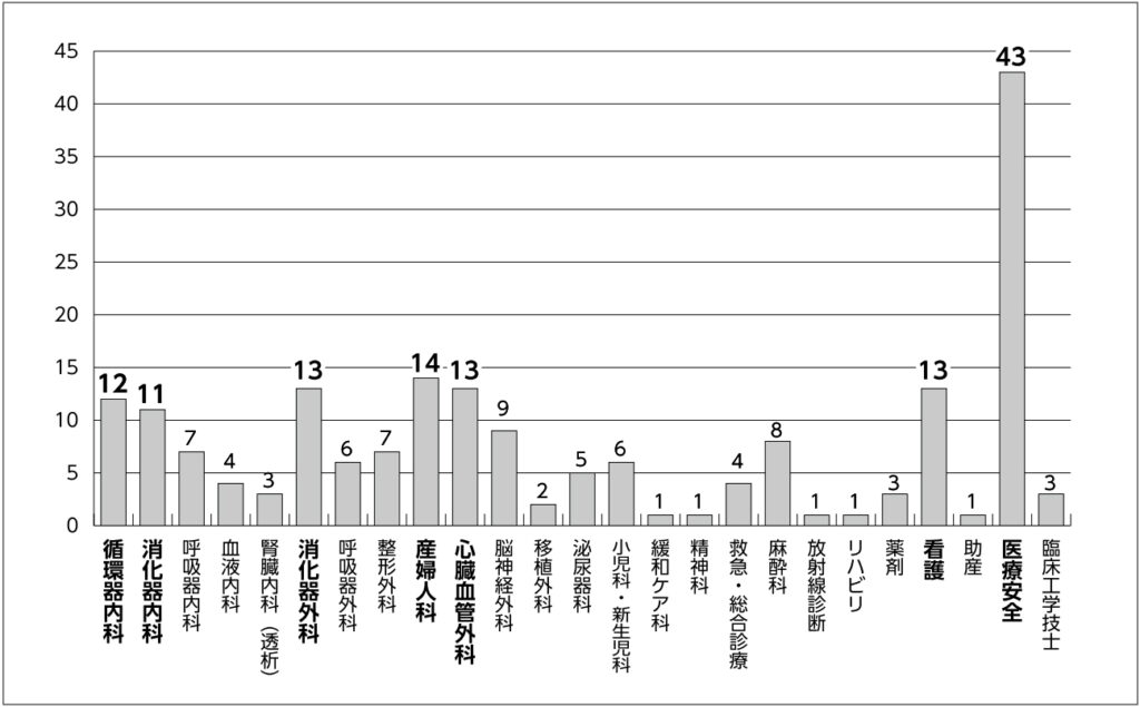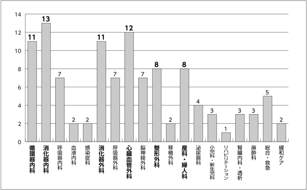 診療科別では,内科系では「循環器内科(11 件)」,「消化器内科(13 件)」が多く,外科系では「消化器外科(11 件)」,「心臓血管外科(12 件)」,「整形外科(8件)」,「産婦人科(8件)」であった。その他,「呼吸器内科(7件)」,「呼吸器外科(7件)」,「脳神経外科(7件)」。