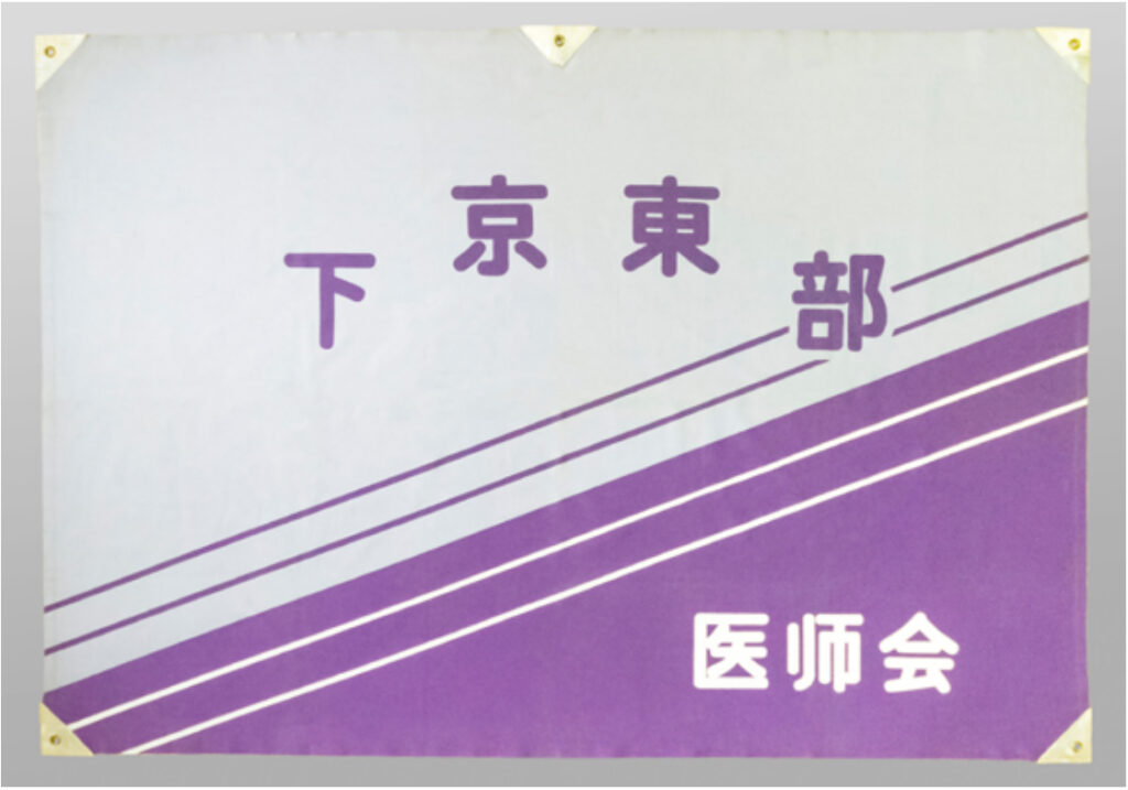 昭和21年6月、現在の南区を含む下京の東部が下京第一支部となり、昭和22年1月に下京東部医師会が発足しました。昭和23年の会員数は7班75名、当時のA会員の入会金30円、月会費10円には物価の違いを感じます。昭和30年9月におおむね当時の国鉄東海道本線以南を南区として下京区から分区された後、昭和57~58年頃に下京西部医師会から「南区にある医療機関を合併して南区医師会を新設しよう」と打診があったものの、「下東を壊したくないから南区に税務署ができたら考えよう」と反対されたそうで、その想いは『下東医旗』にも込められています(図1)。会長任期は2年、副会長が次期会長を務める伝統が続いており、現在第36代会長を前田眞里先生が務めています。