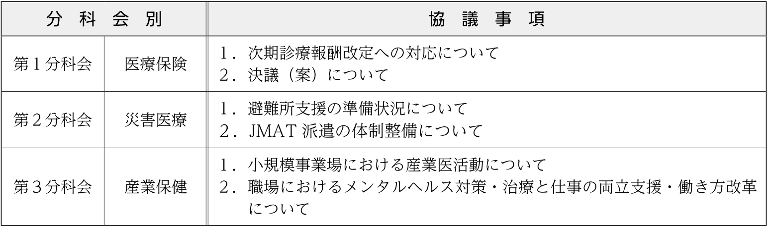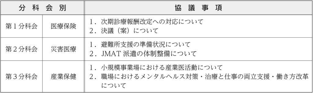 午前中に行われた分科会では,第1分科会「医療保険」,第2分科会「災害医療」,第3分科会「産業保健」に分かれて各府県医で議論を交わしたほか,併せて常任委員会も開催された。