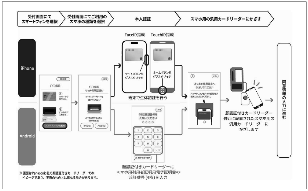 患者がスマホ保険証を医療機関で使う際には,まず受付に設置された顔認証付きカードリーダーを操作し,最初の画面で「スマートフォンを利用」を選択し,次の画面で自身のスマートフォンのOSを選択し,図の手順で操作をします。