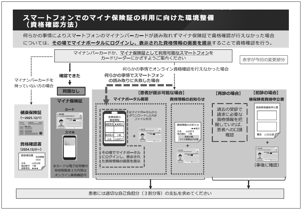 何らかの事情でスマートフォンの読み取りに失敗しマイナンバーカードや資格確認書を持参していない場合は,患者にその場でマイナポータルにログインしてもらい,窓口の方が表示された資格情報の画面を確認することで,資格確認を行ってください。