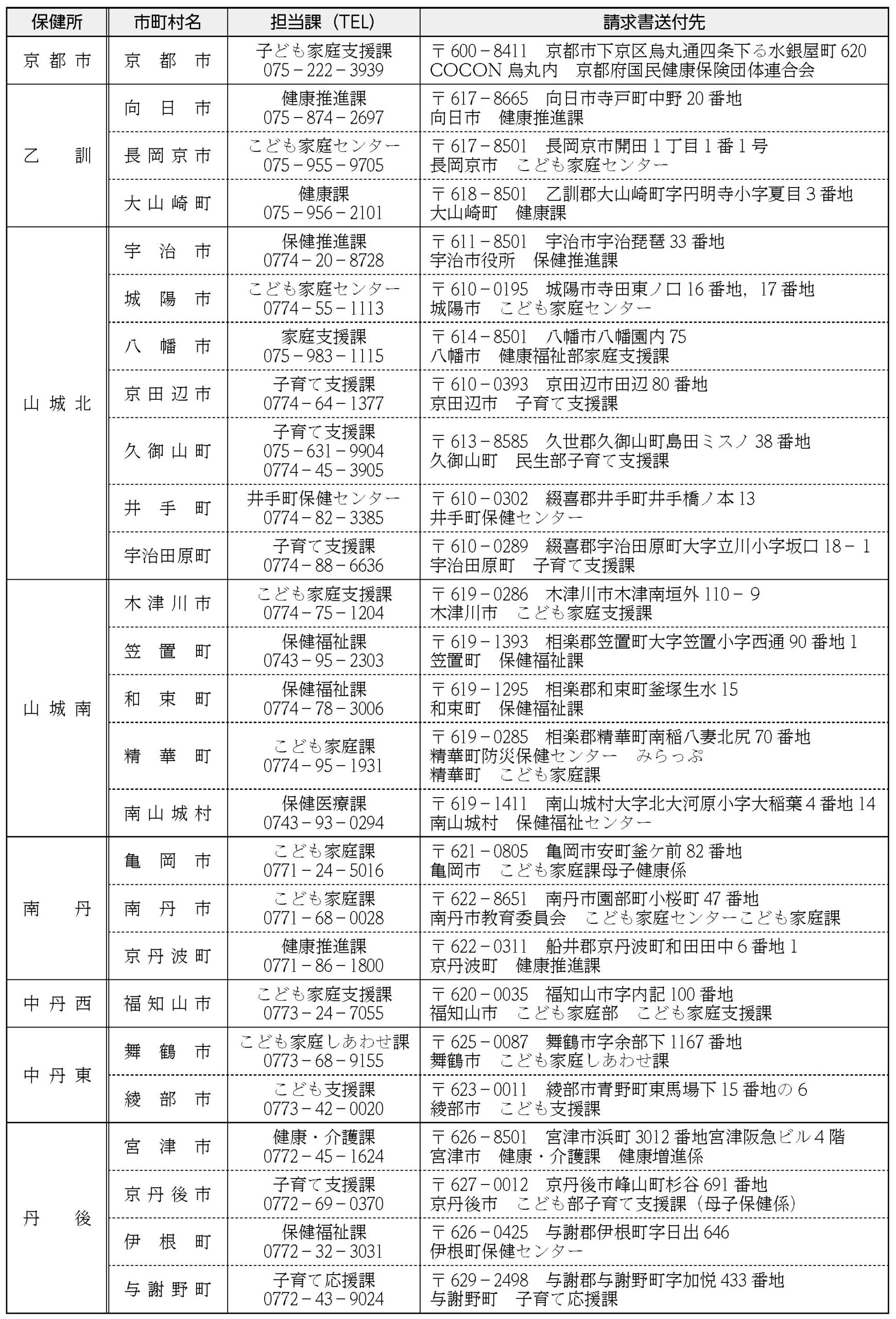 7.1か月児健康診査助成事業に係る市町村の連絡先・請求書送付先一覧