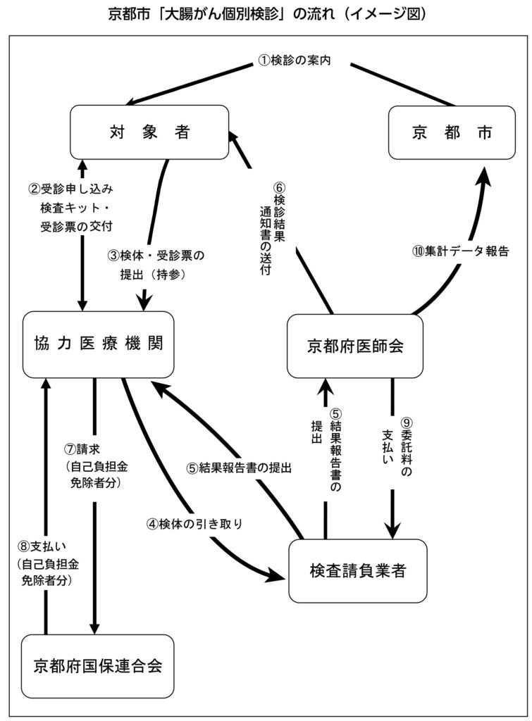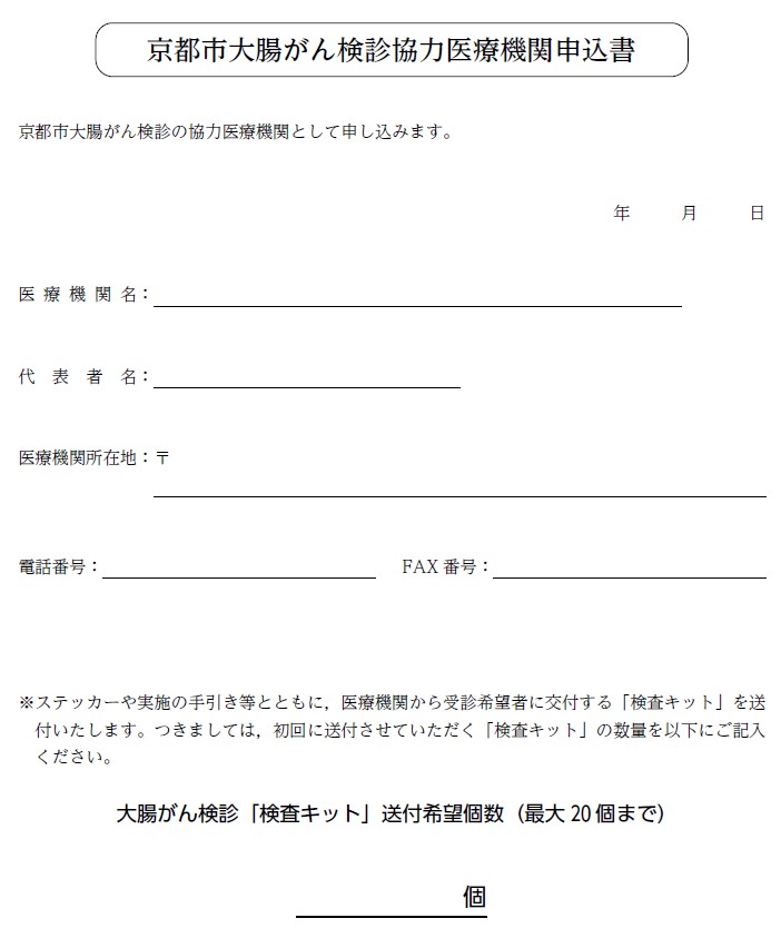 府医では会員医療機関各位のご協力を得まして,40 歳以上の方を対象とした京都市大腸がん検診(個別方式)を実施しております。今年度も以下の実施要領に基づき,協力医療機関を募集いたしますので,対応可能な医療機関は是非ご応募ください。