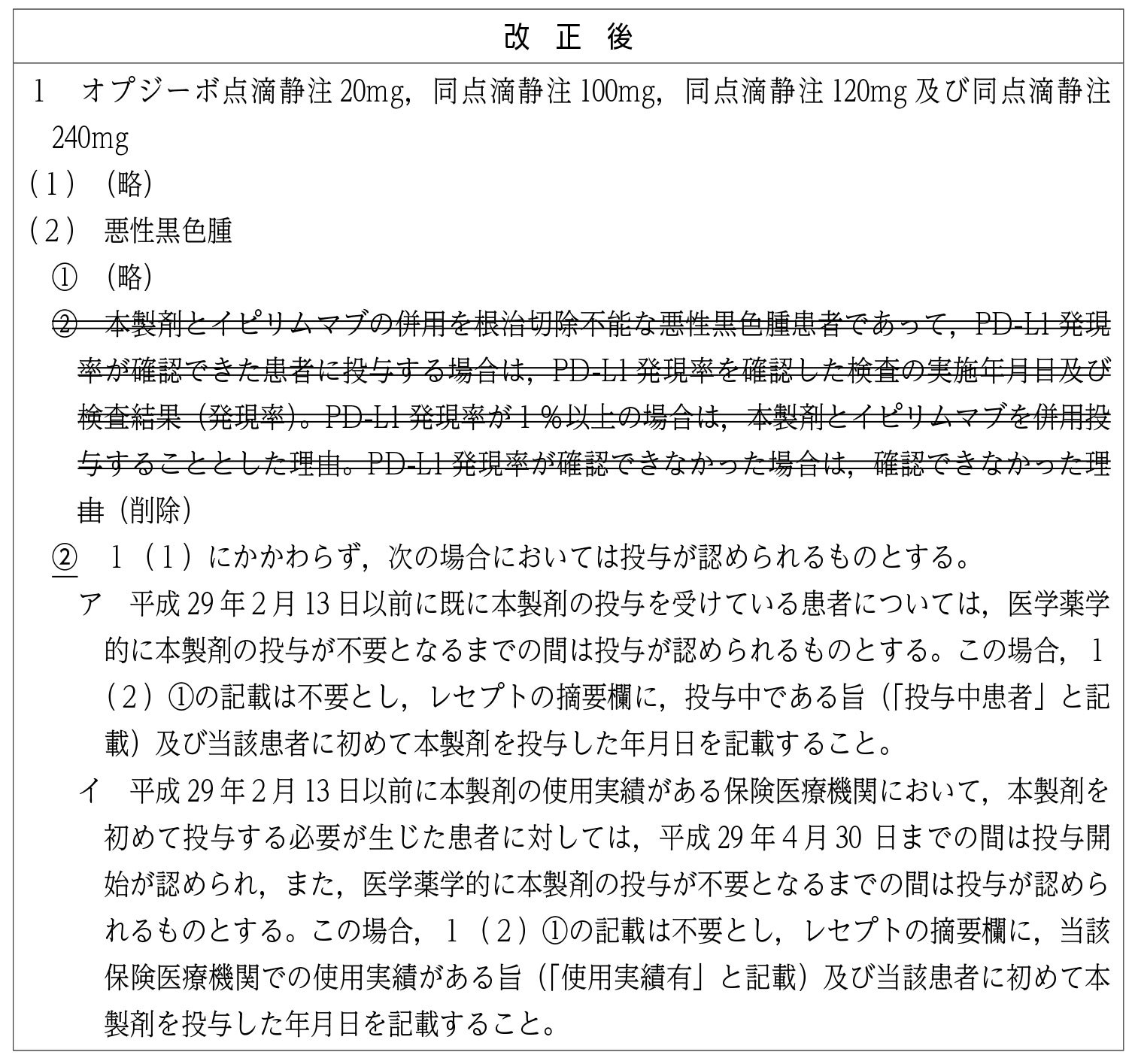 ◎「抗PD-1抗体抗悪性腫瘍剤に係る最適使用推進ガイドラインの策定に伴う留意事項について」(平成 29 年2月 14 日付け保医発 0214 第4号)の記の1 (傍線部分は改正部分)