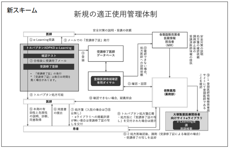 • 本効能・効果については,トルバプタン製剤の適正使用が可能な医師によってのみ処方され,さらに,医療機関・薬局においては調剤前に当該医師によって処方されたことを確認した上で調剤がなされるよう,医薬品,医療機器等の品質,有効性及び安全性の確保等に関する法律(昭和35年法律第145号)第79条第1項に基づき,製造販売業者に適切な流通管理の実施を義務付けたこと。