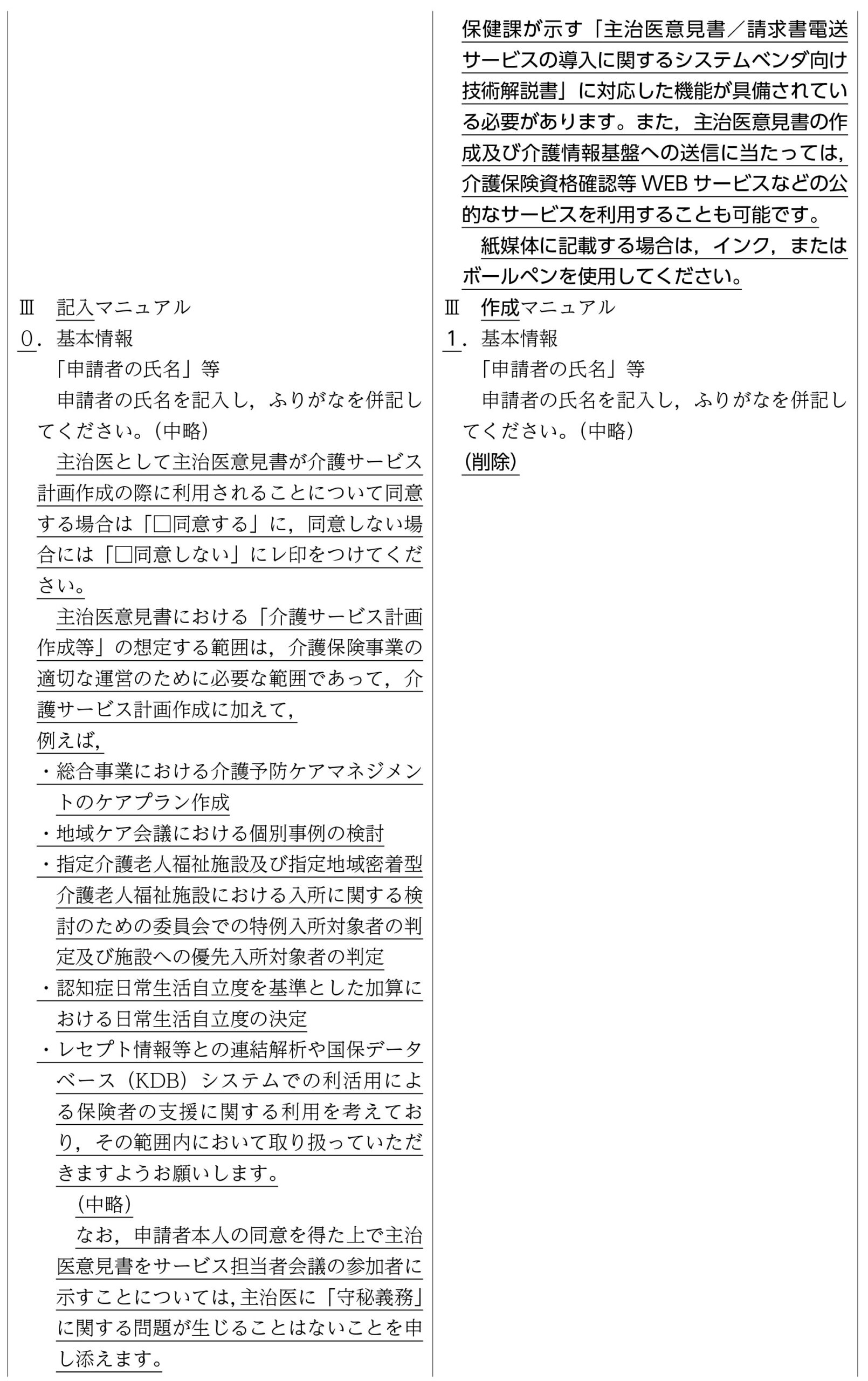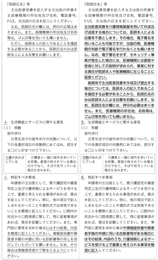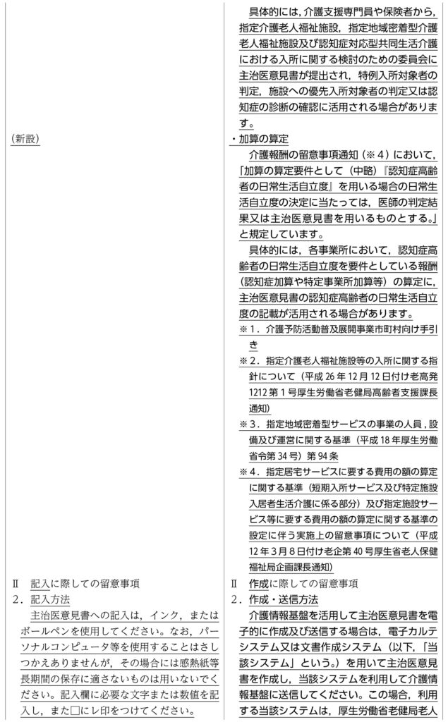 また,「手引き」には医師自署の取り扱い等,介護情報基盤を用いて作成および送信する場合の留意点が追記されていますが,主治医意見書については,従来どおり紙による作成でも差し支えございません。