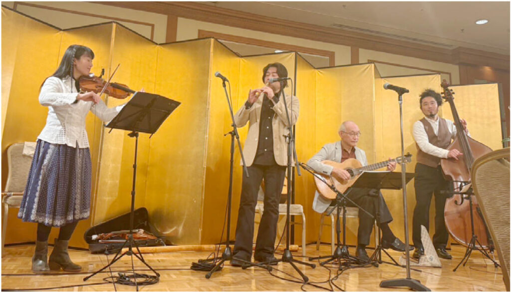 祝宴は森岡香朱様による乾杯の発声で始まり,しばらく休館になるブライトンホテルの美味しいお食事を名残惜しく楽しみました。食事中もギターの千葉氏が,サプライズで南米の邪気払の曲とペルーの曲を歌って下さり,皆様の手拍子も加わり,大いに盛り上がりました。本当に笑顔いっぱいの明るく楽しい新年会となりました。
