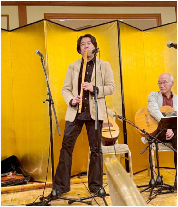 次に南米のボリビア,ペルーの舞踊曲を演奏していただきました。ボリビアの「クエッカ」,「コンドルは飛んでいく」の元曲,ベルーの「マリネラ」をケーナを用いて演奏されました(ケーナはきしもと氏お手製の竹でできた50cm位の縦笛です)。