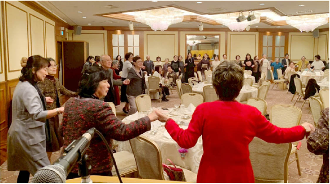 どの曲も皆で楽しむための曲で,皆さんのテシショトも上り,「アンコール」の声がかかりました。先生は,「日本には手を繋いで踊る踊りが無く,手を繋ぐ踊りを広めたいと思っている。だからアンコールを弾くので,ぜひ皆さんに踊ってほしい」と提案されました。熊澤洋子氏の指導のもと出席者のほとんどの方が立ちあがり,手を繋ぎ大きな輪となって前に3歩,後ろに3歩の踊りを踊りました。演者の方々,出席者の皆様,みんな笑顔の中,演奏会は終わりました。