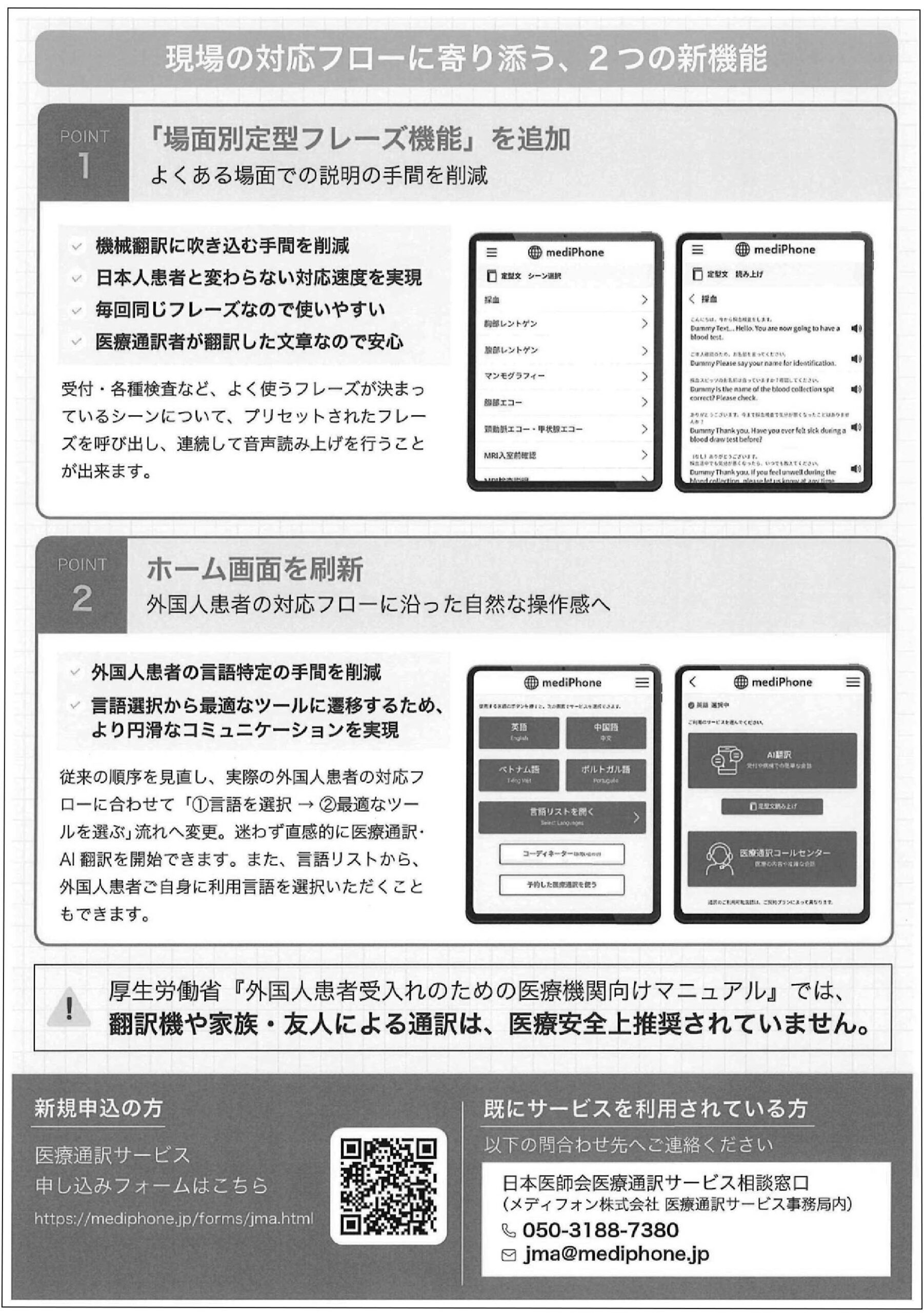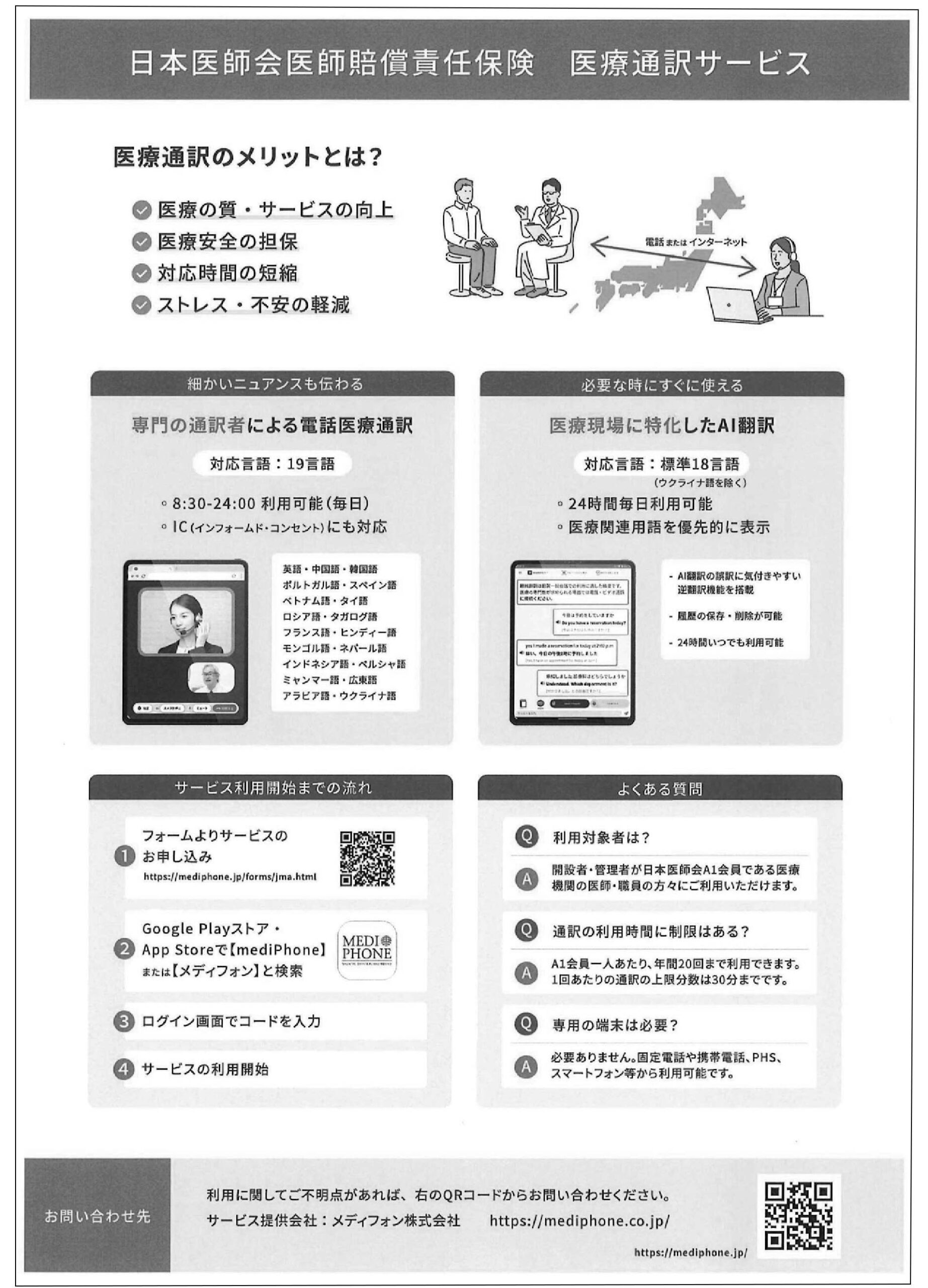 そのような中,外国人患者への対応ツールとして有効であり,A1会員の日医医賠責保険に令和2年4月から付帯されている「医療通訳サービス」において,令和8年2月1日から機能追加が実施されましたので,ご案内します。